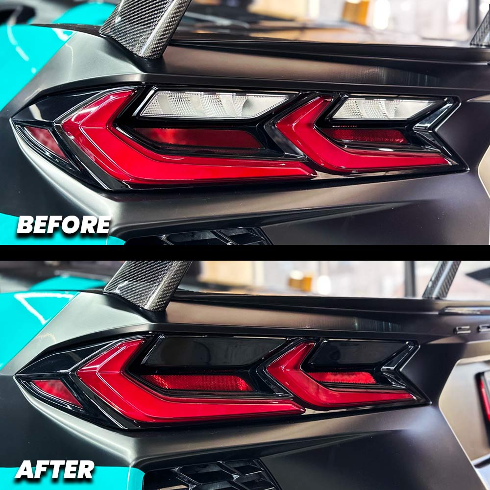 The Chevrolet Corvette C8 Reverse / Turn Signal Overlay is offered in Smoked, Light Smoked, JDM Yellow, or Cherry Red finish. Designed to give a sophisticated and aggressive finish to your vehicle. With a matching color, this overlay will provide a subtle yet stylish touch to your C8.